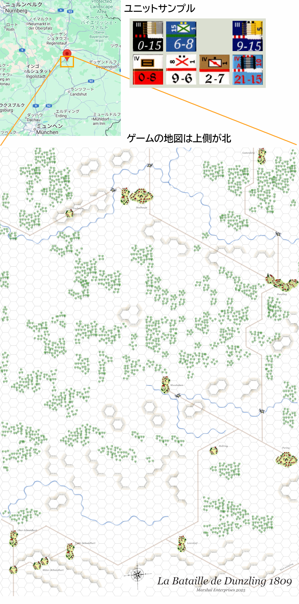 - 2)デュンツリンクの場所を示すgoogleマップ、ゲームの地図とサンプルユニットは、