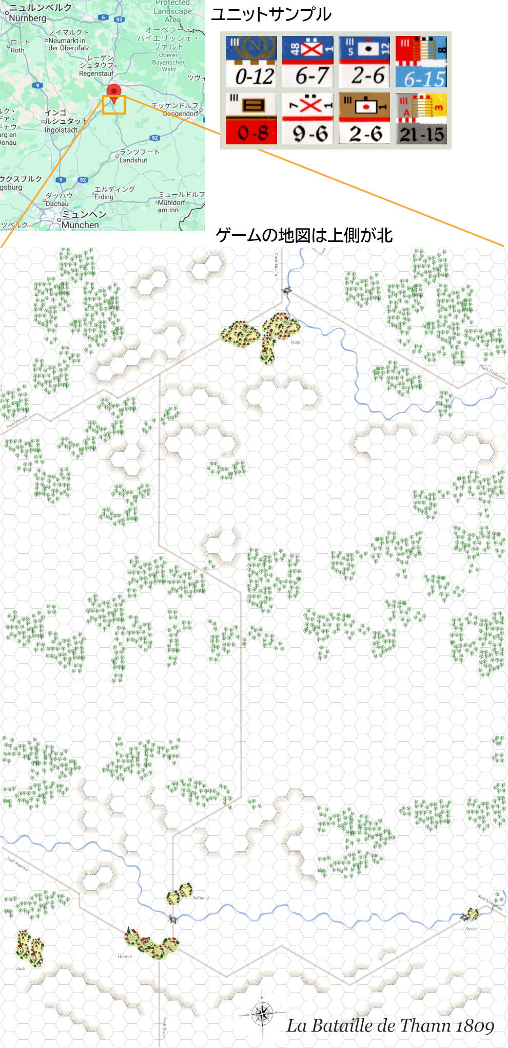 - 2)ターンの場所を示すgoogleマップ、ゲームの地図とサンプルユニットは、