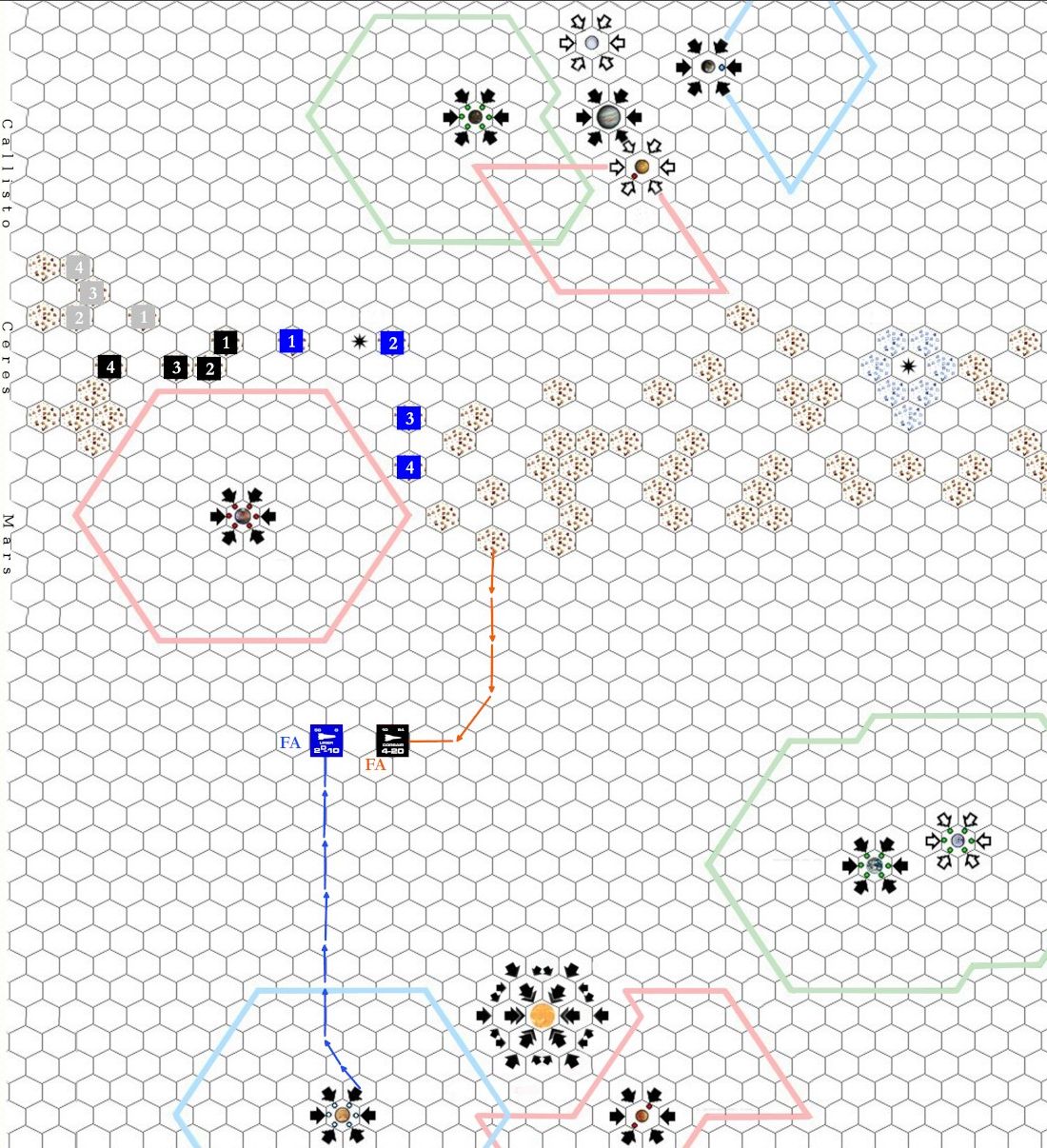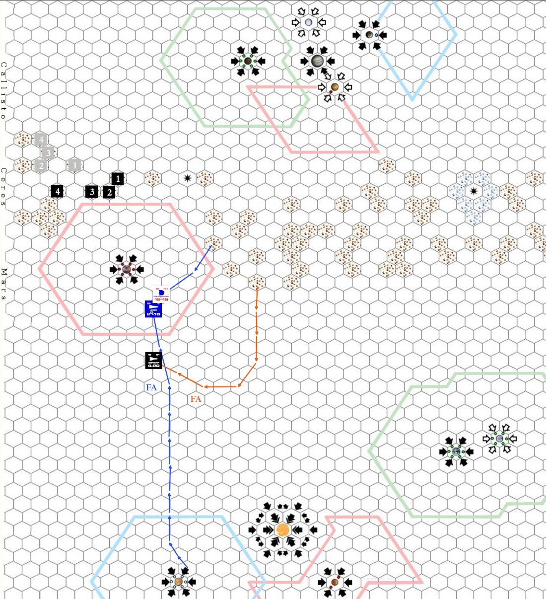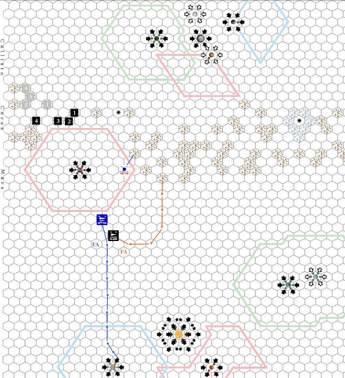 客船が金星を出発し、9ターンが終了した時点での艦船位置全体図は下図の通り。