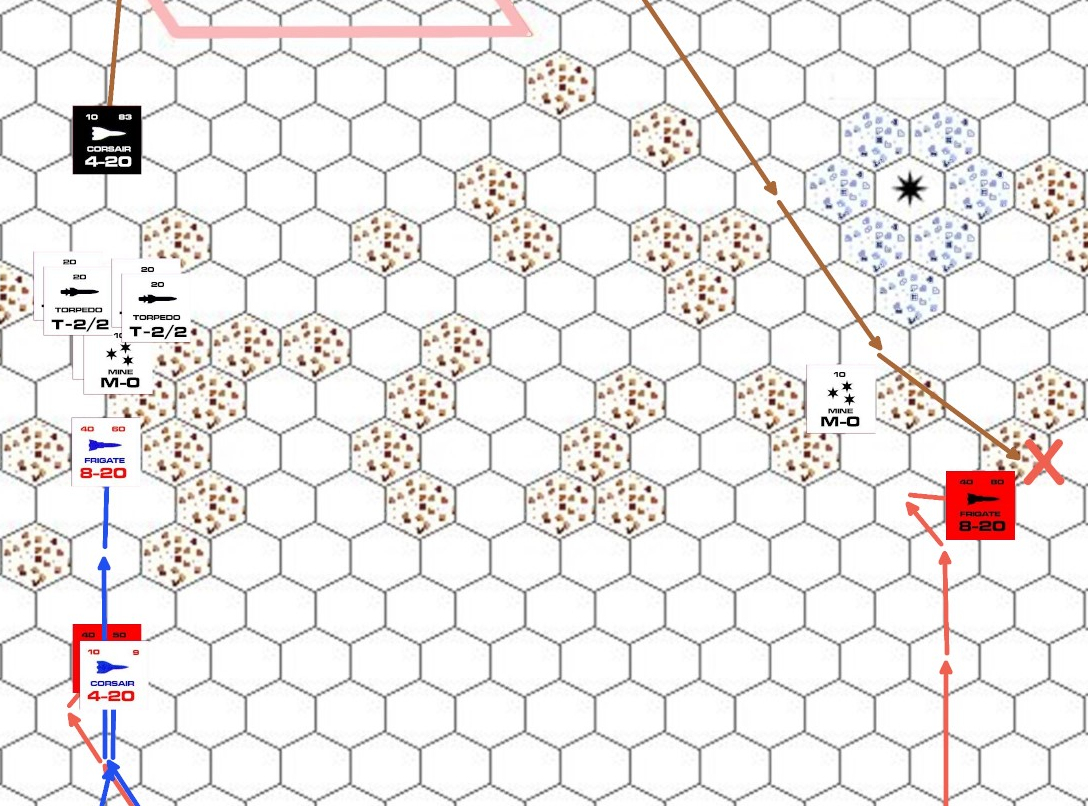 西側陣営戦隊1は魚雷4,機雷2を発射し、減速停止した。(2番目の図)
