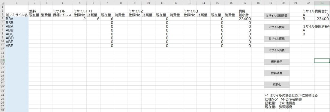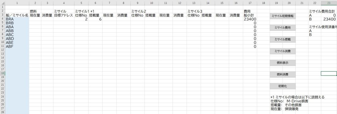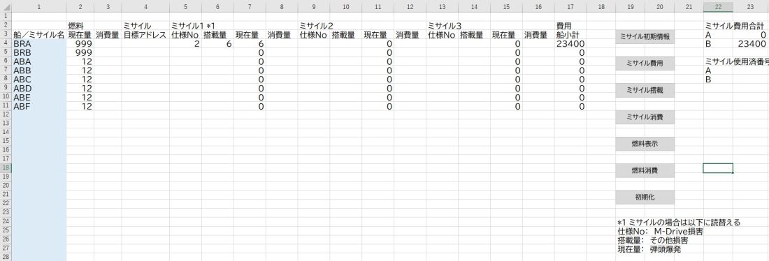 (3)実際に使うミサイルの仕様Noと搭載量を入力すると費用が17列に表示される。(下図)