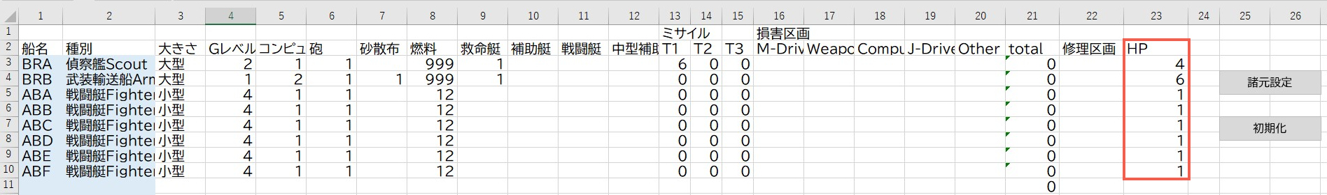 21列目の損害合計が23列目のHP以上になったら、船は破壊されると判定する。