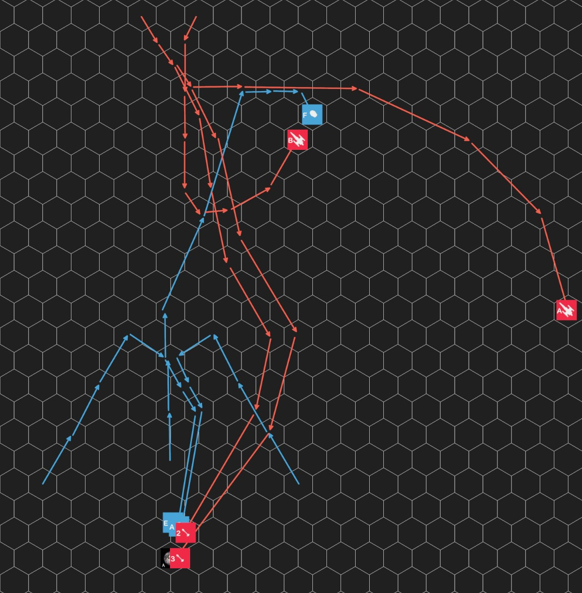 ・防御側は戦闘艇A、Eが最後の燃料を使ってミサイル2のHEXへ到達し、