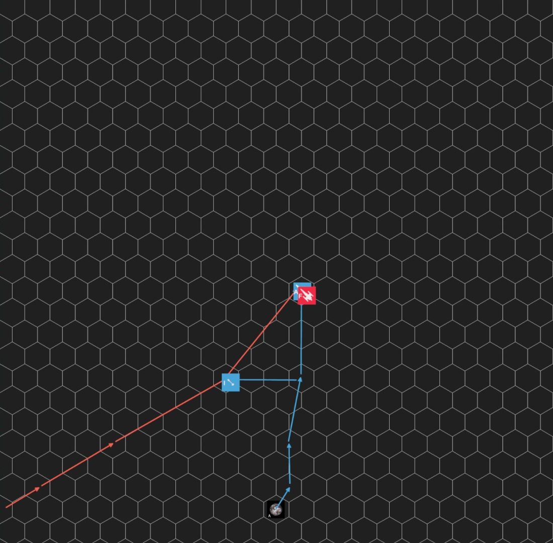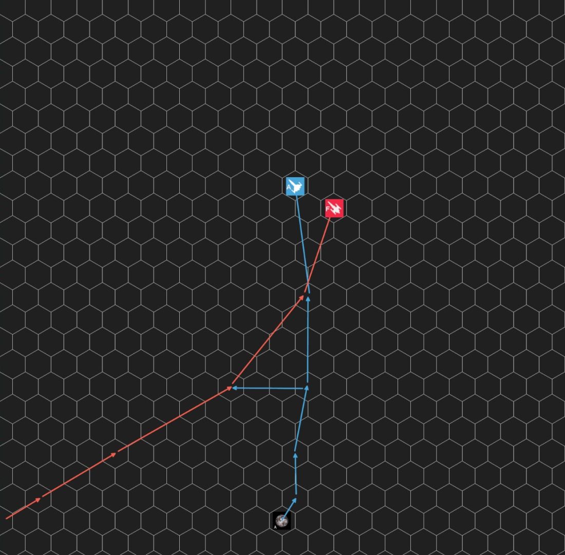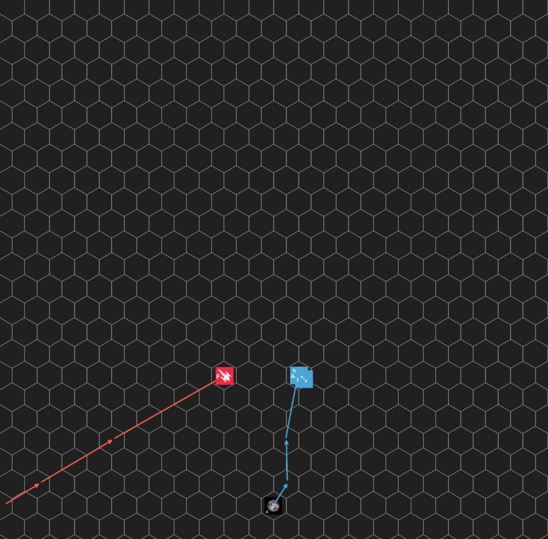・海賊船は自由貿易船と同じ縦HEX位置から進入し、速度を2まで上げた。