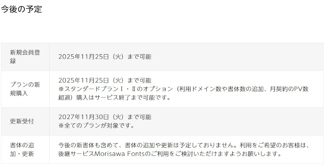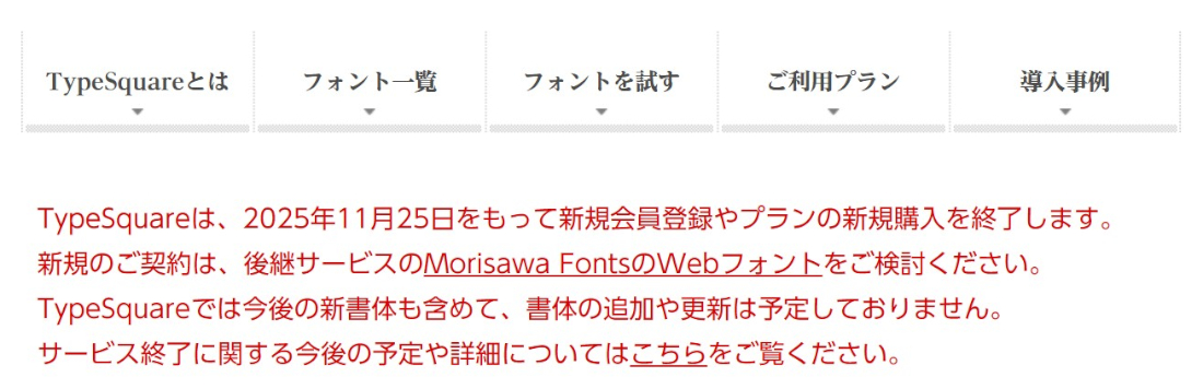 下図のようにモリサワのフォントを使う為に必要なTypeSquareサービスが終了になる。