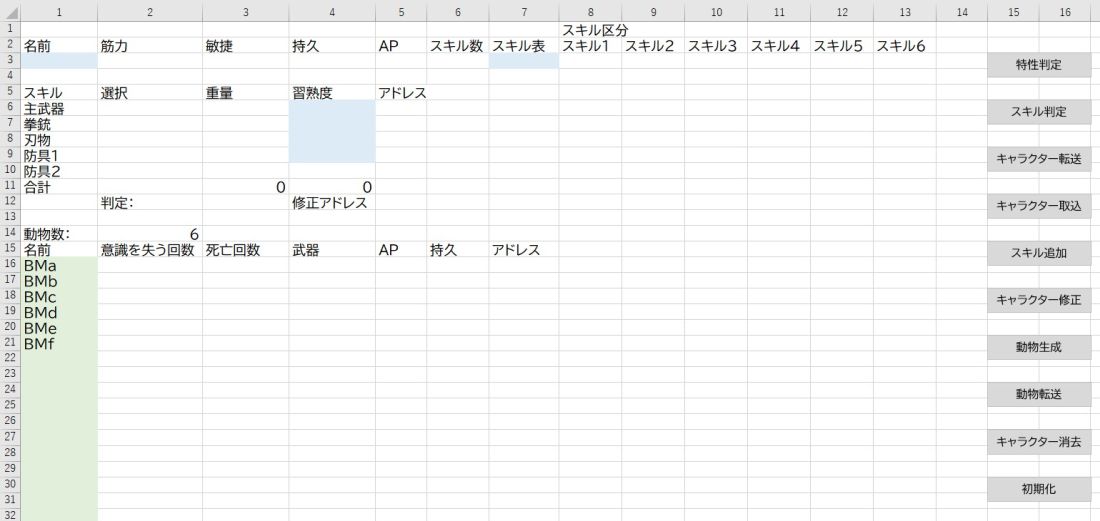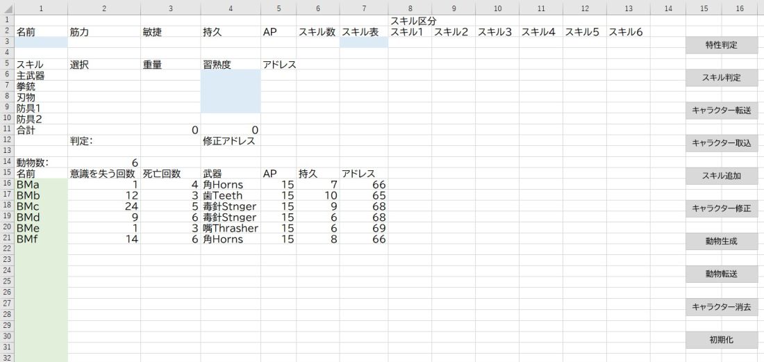 動物の行動ポイントは一律15で人物と違う。スキルはなく、持久力は鎮静剤弾Tranqの命中判定用である。