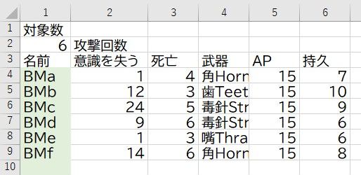 敵は強いのが1匹BMc、弱いのが2匹BMa、BMe、中位のが3匹BMb、BMd、BMfと