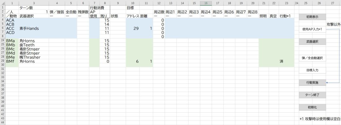 行動実施を押すと行動欄に済の表示が出て、動物fはこのターンの行動を終了する。(下図)
