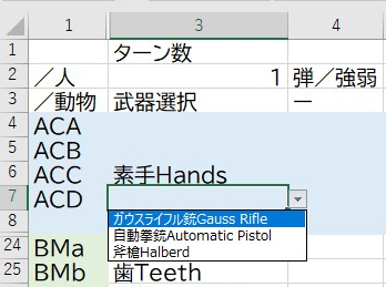 行動画面の武器選択で上記の武器が選択可能になる。(下図)