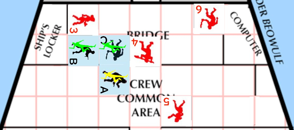 ・ハイジャック犯5は手すりに沿って2マス進み、乗員共有エリアに留まる。