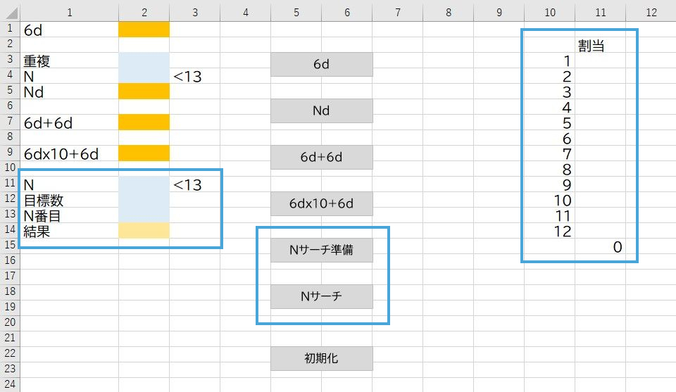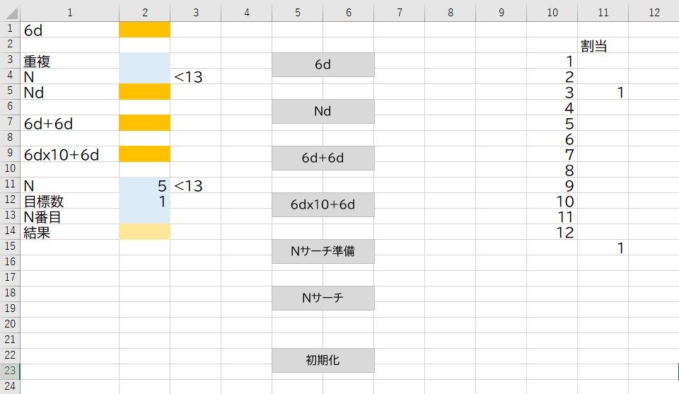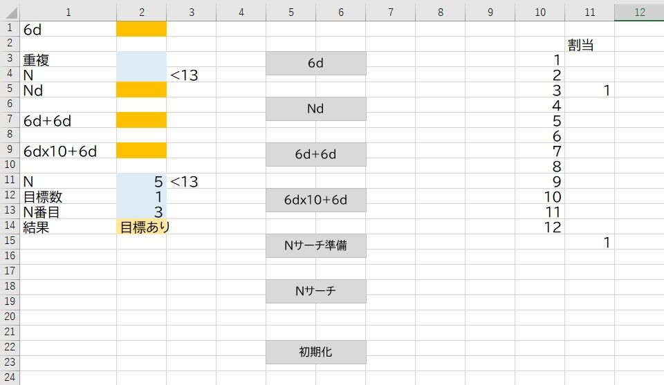 11行2列目に総数N、12行2列目に目標数tg(当たりの数)を入れて、Nサーチ準備ボタンを押す。