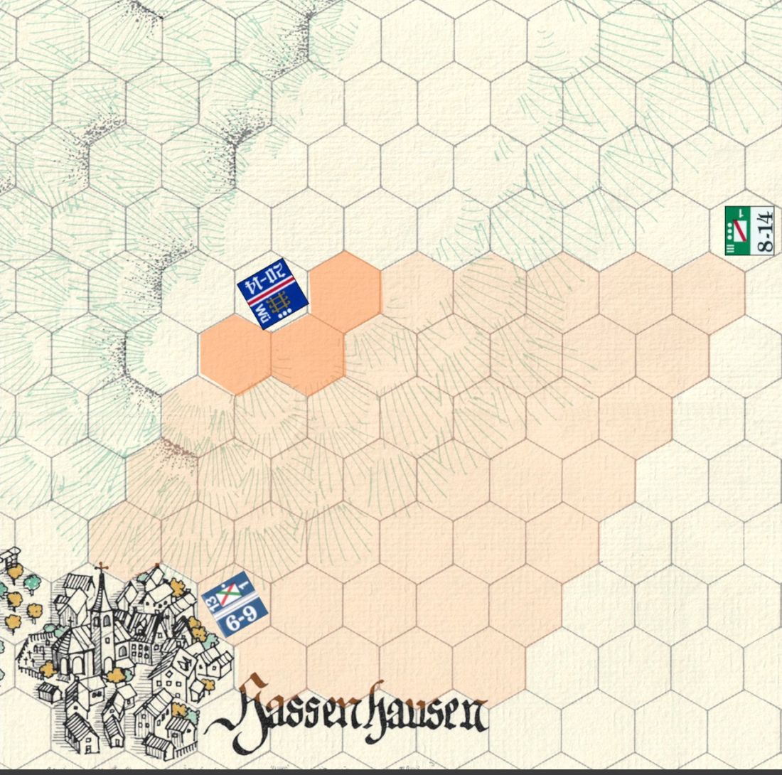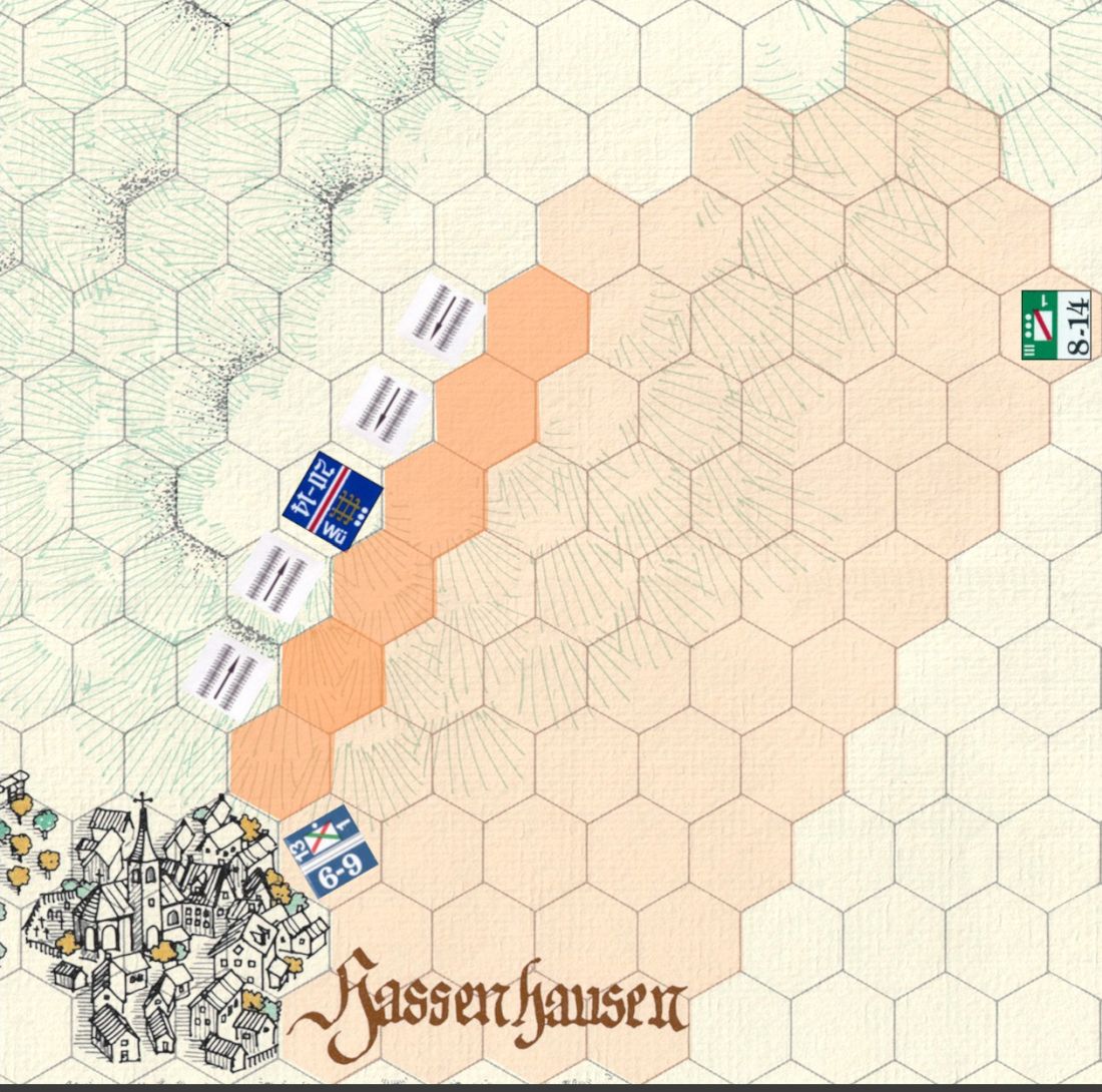 散開隊形では下図のようになり、フランス軍歩兵のハッセンハウゼン村迂回機動に制限を掛けられる。