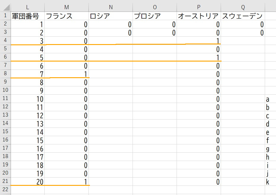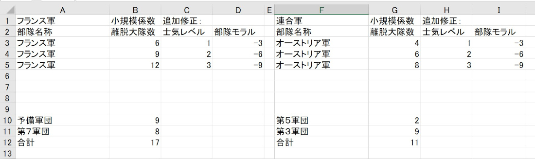 両軍とも部隊モラル表は1つなので、各軍団のアドレスも1に固定される。20(k)は予備軍団を示す。