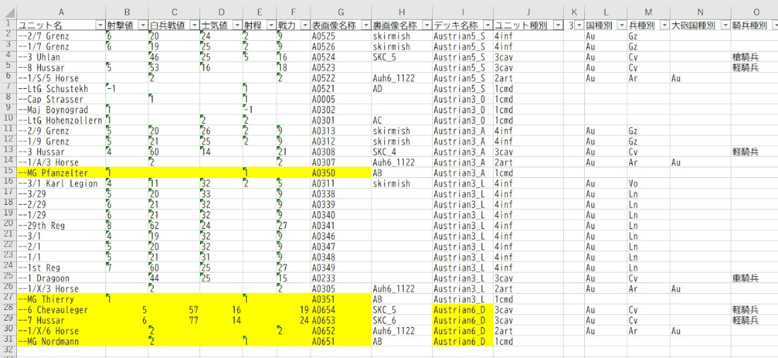 部隊モラル表を初戦で戦う部隊と遅れてくる部隊に分けようか迷ったが、そうすると